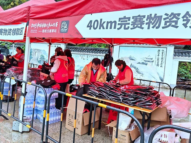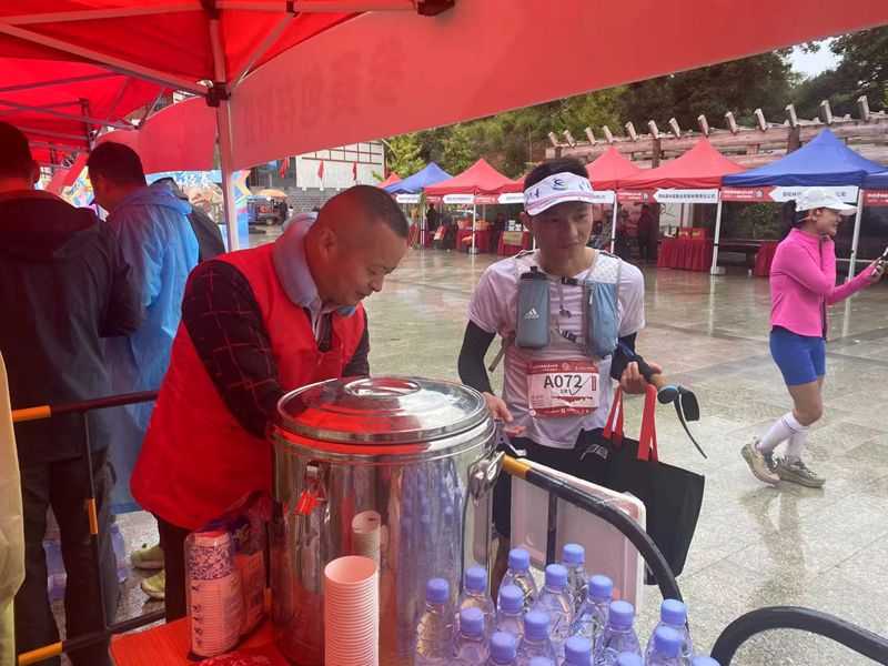 清晨六点,天色微明,义工志愿者身着义工服在起点集结。雨丝虽密,却浇不灭大家的热情。他们迅速投入工作,分发赛事包、布置指引牌、检查补给物资。赞助商提供的防水号码布等物资整齐码放,“诗歌之乡”纪念徽章在雨中闪烁。义工夏大姐边整理边念叨着要把服务做到贴心,转身又去准备热姜茶,忙碌的身影温暖人心。