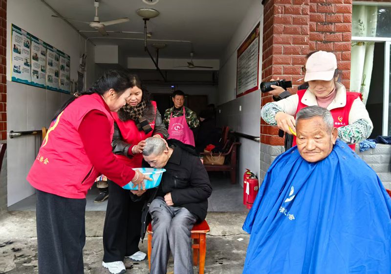 华亭镇党委委员邓顶峰宣布活动开始。义工协会志愿者们分工合作,有的为老人洗头理发,有的为老人修剪指甲,还有的在厨房为老人们准备了可口的美食。