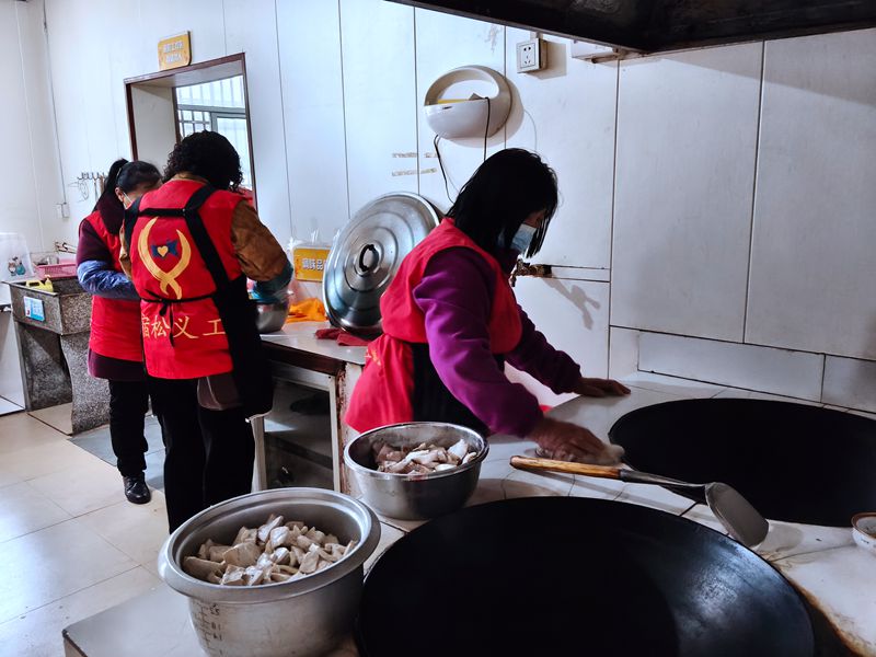 当所有人还沉浸在优美的黄梅戏声中时,一阵扑鼻的饭菜香从厨房飘来,厨房组的义工们把早已准备好的热气腾腾的饭菜端到了餐桌上,活动在敬老院的老人们享受美食的赞叹声中宣布结束。
