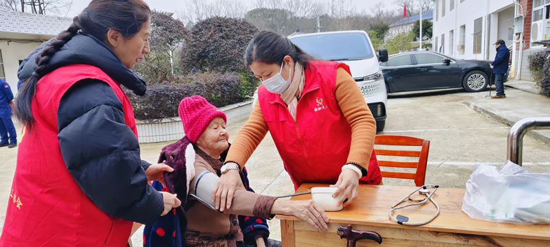 医疗组义工、华亭镇卫生院的李医生,为敬老院的老人们测量血压,指导用药,叮嘱注意事项。